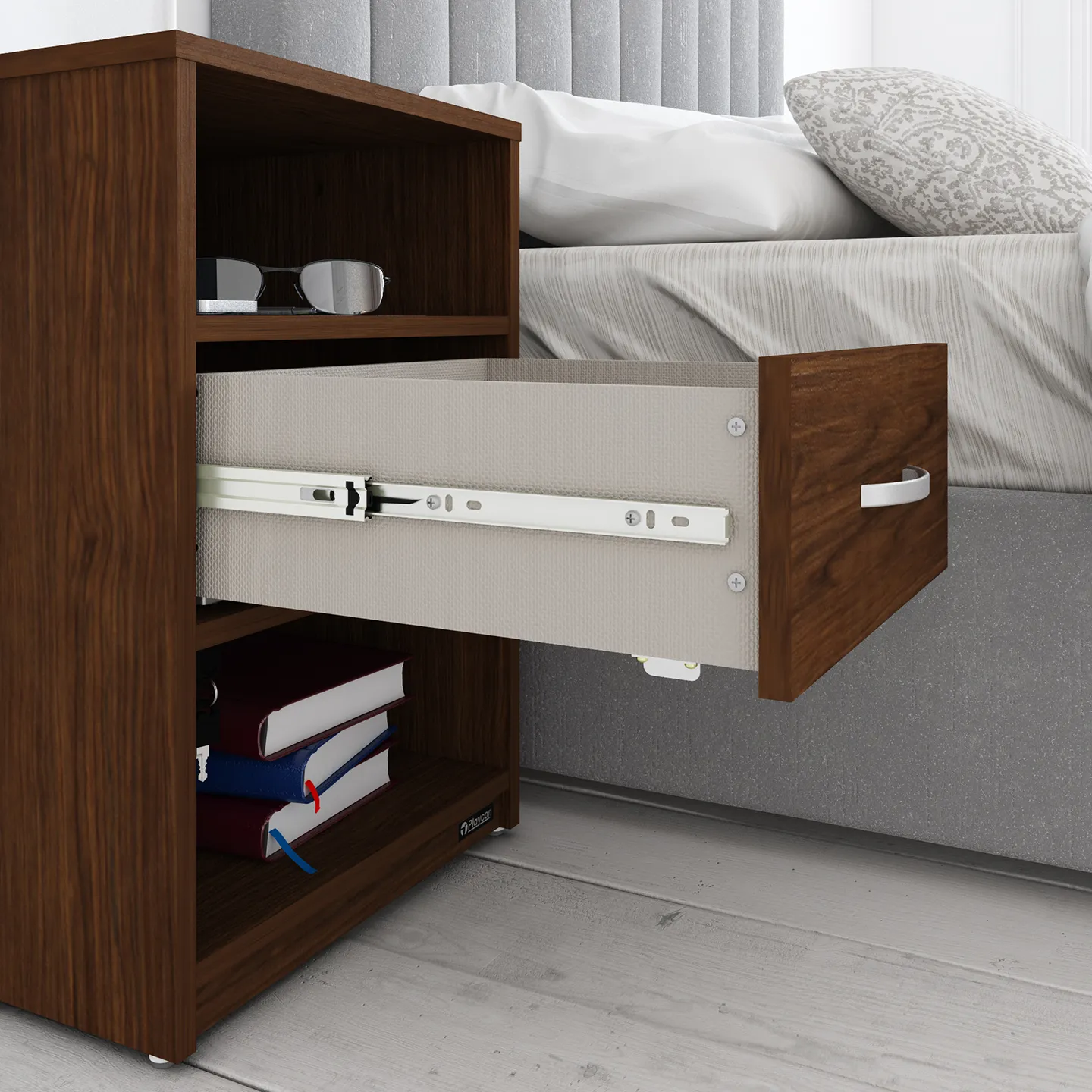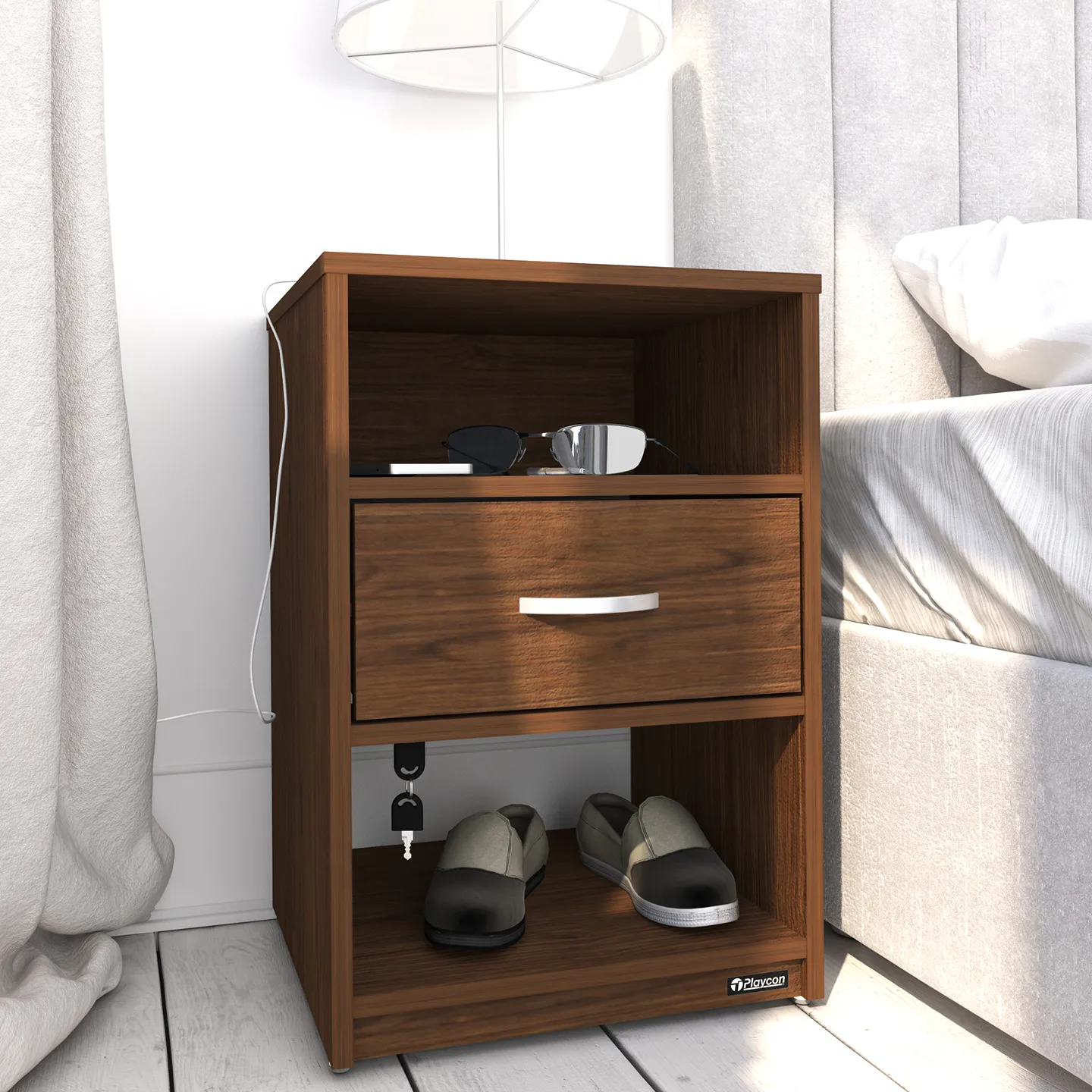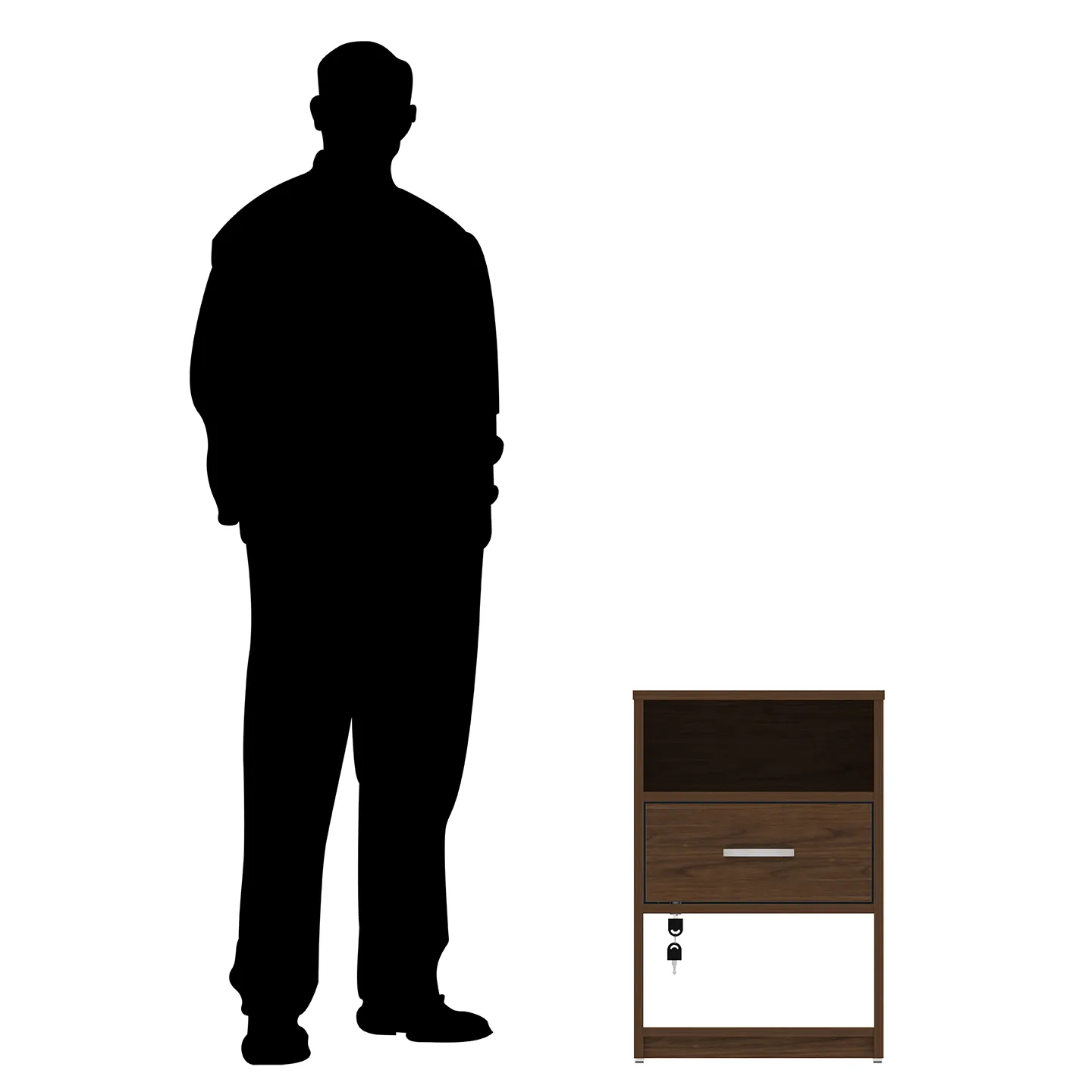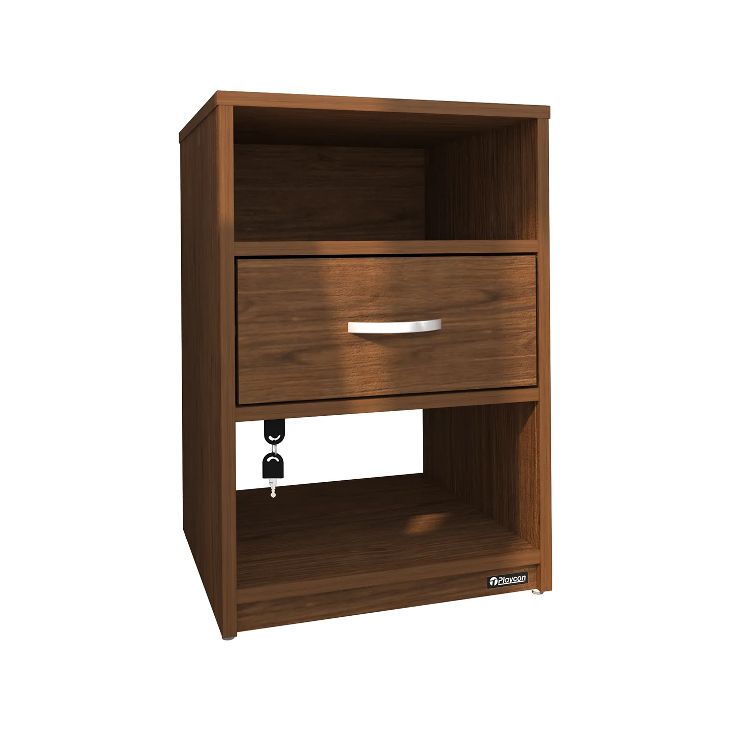 Buró con llave PLAYCON modelo Maui en color grafito. Compacto y funcional con cajón seguro y dos repisas abiertas. Medidas: 62 x 42 x 40 cm.