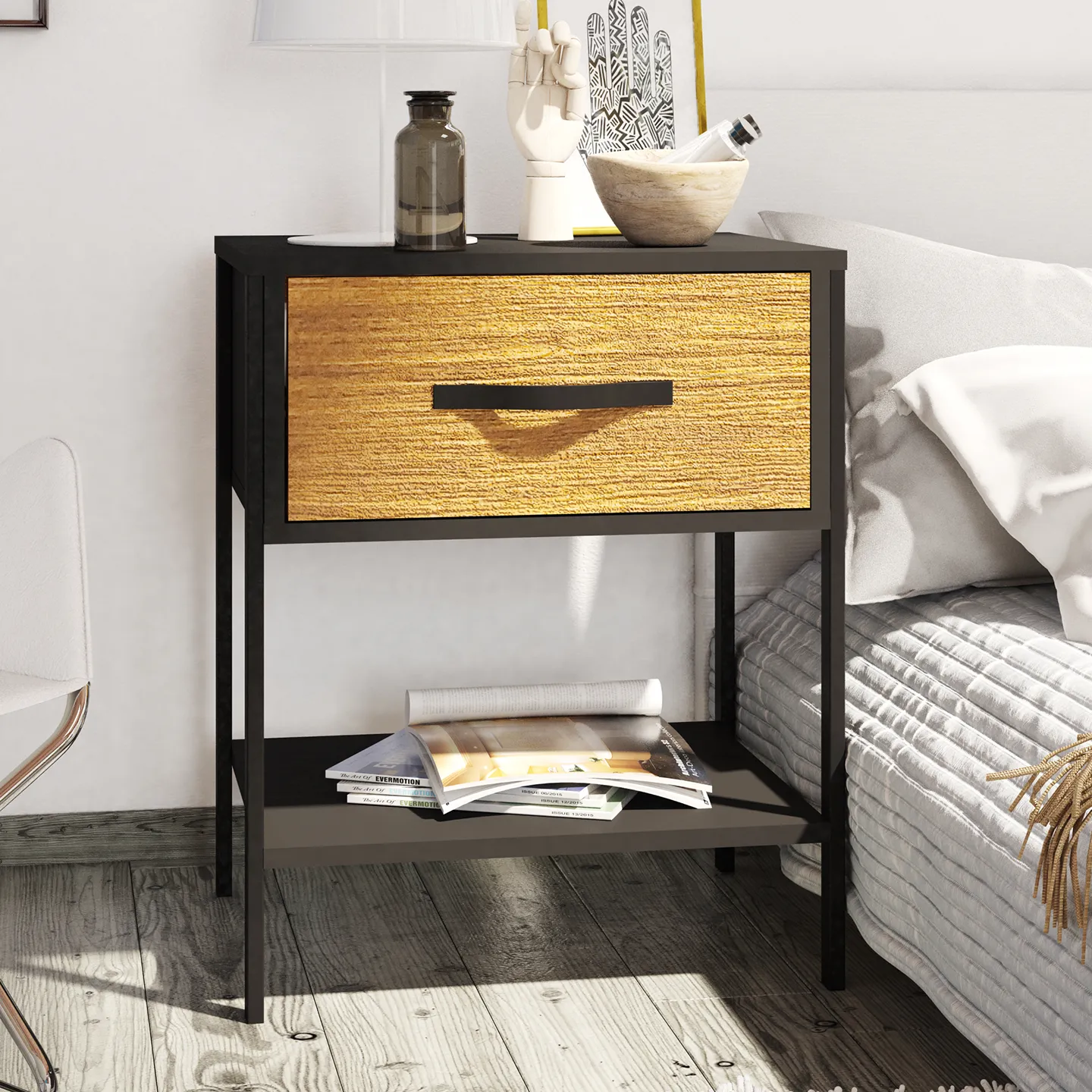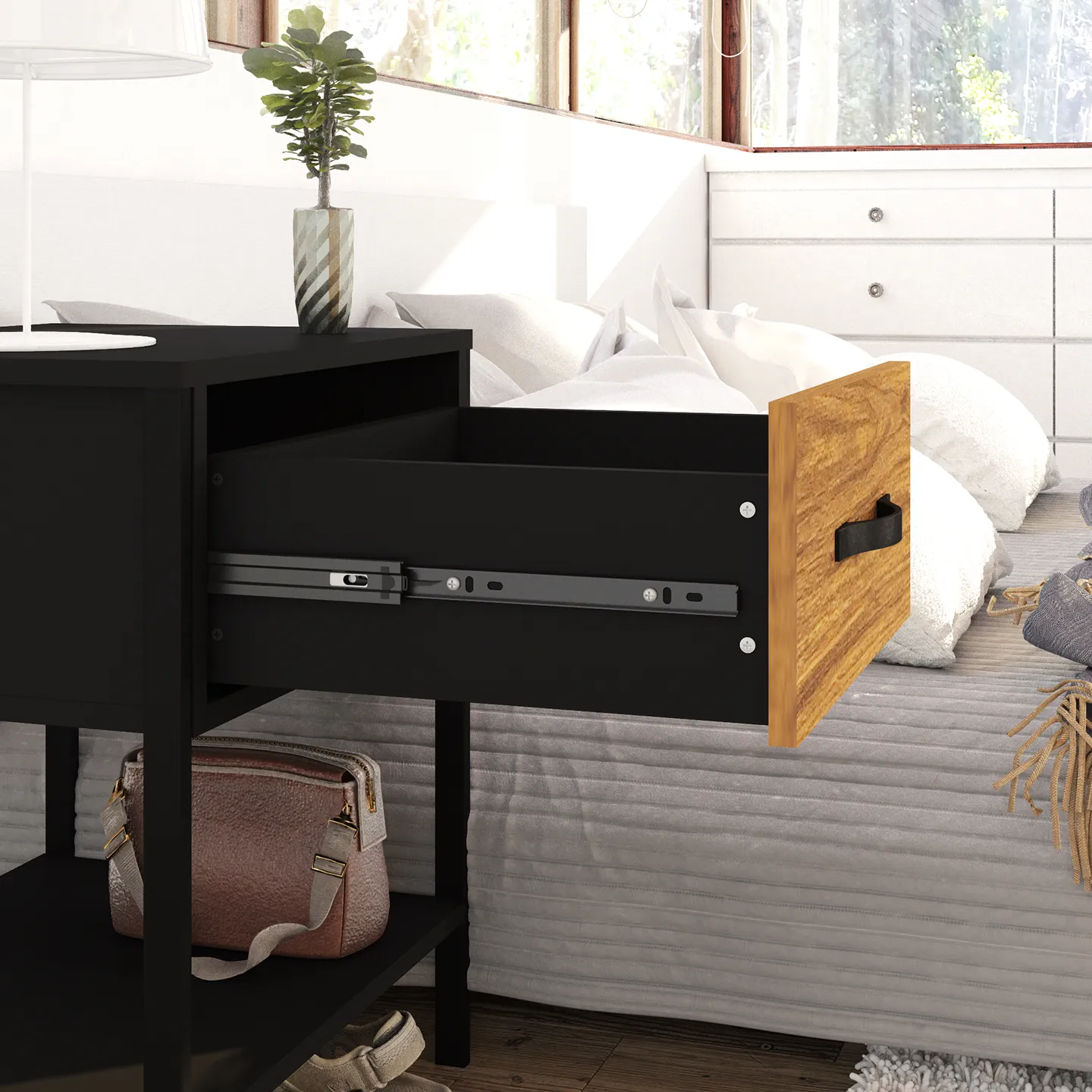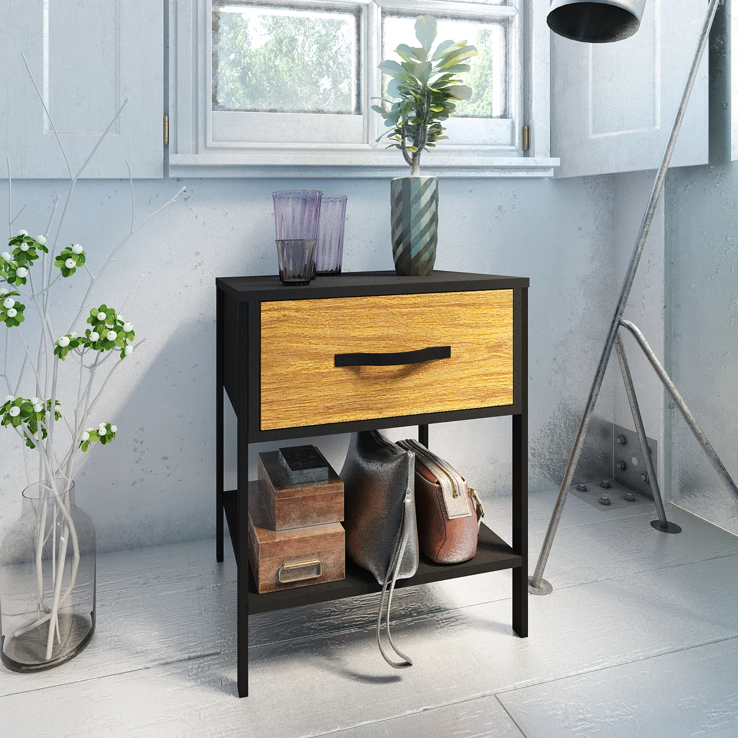 El buró PLAYCON modelo Oslo es la elección ideal para complementar cualquier recámara moderna. Su diseño compacto y funcional cuenta con un cajón amplio que permite organizar objetos personales, libros o accesorios. Fabricado con estructura metálica recubierta en PVC para mayor durabilidad y resistencia a la oxidación. Su tamaño lo hace perfecto como mesa de noche sin ocupar demasiado espacio. Su combinación de colores sobrios y su ensamble sencillo lo convierten en una solución práctica y elegante para el hogar.