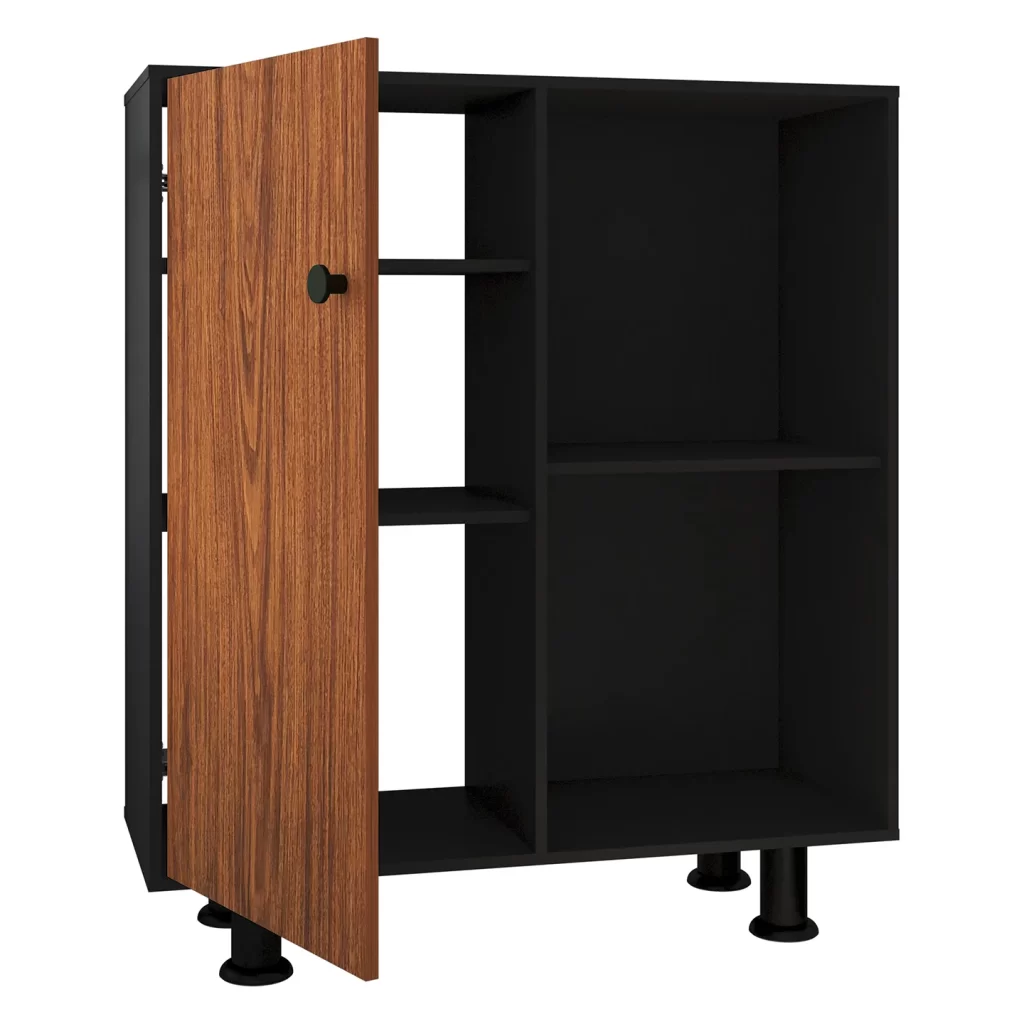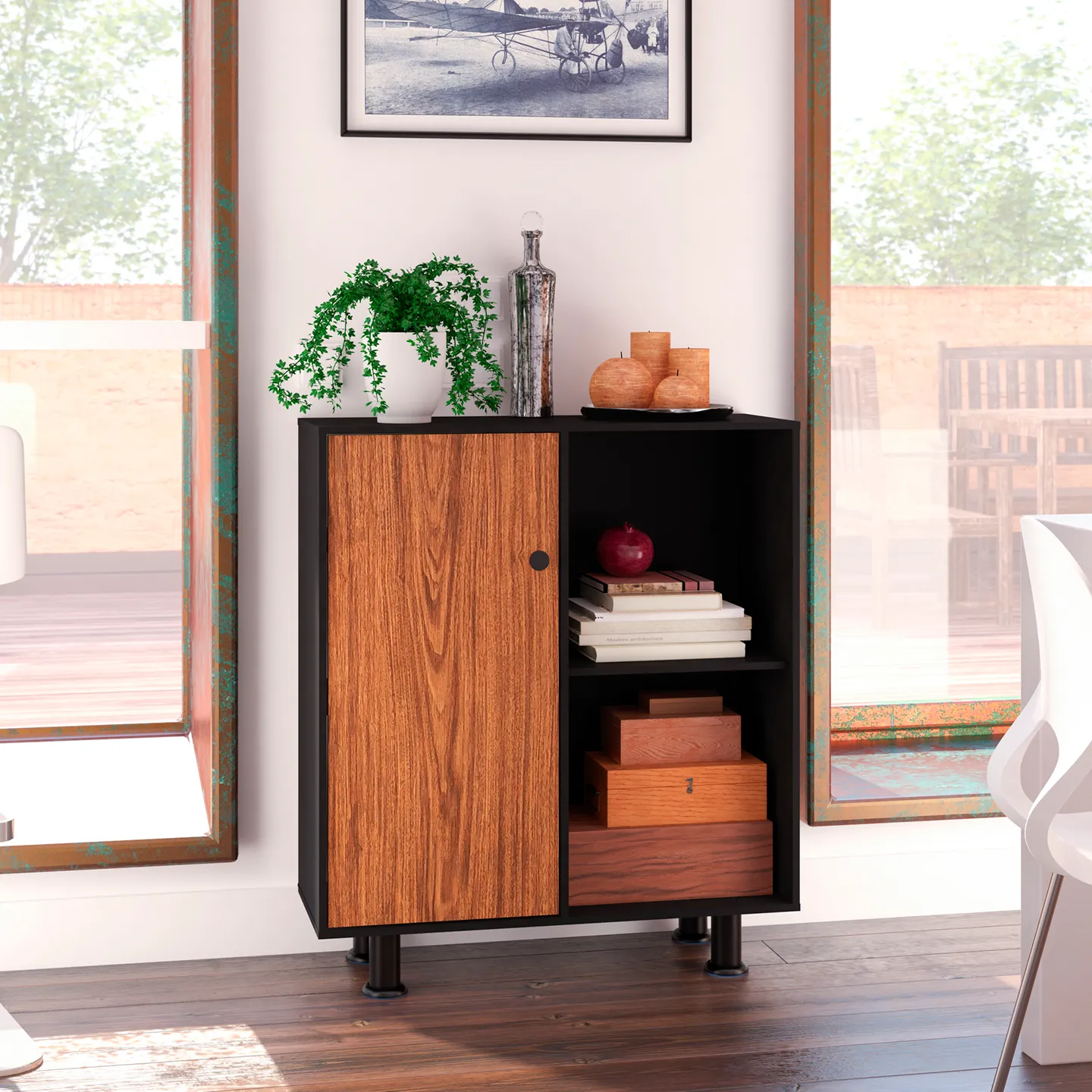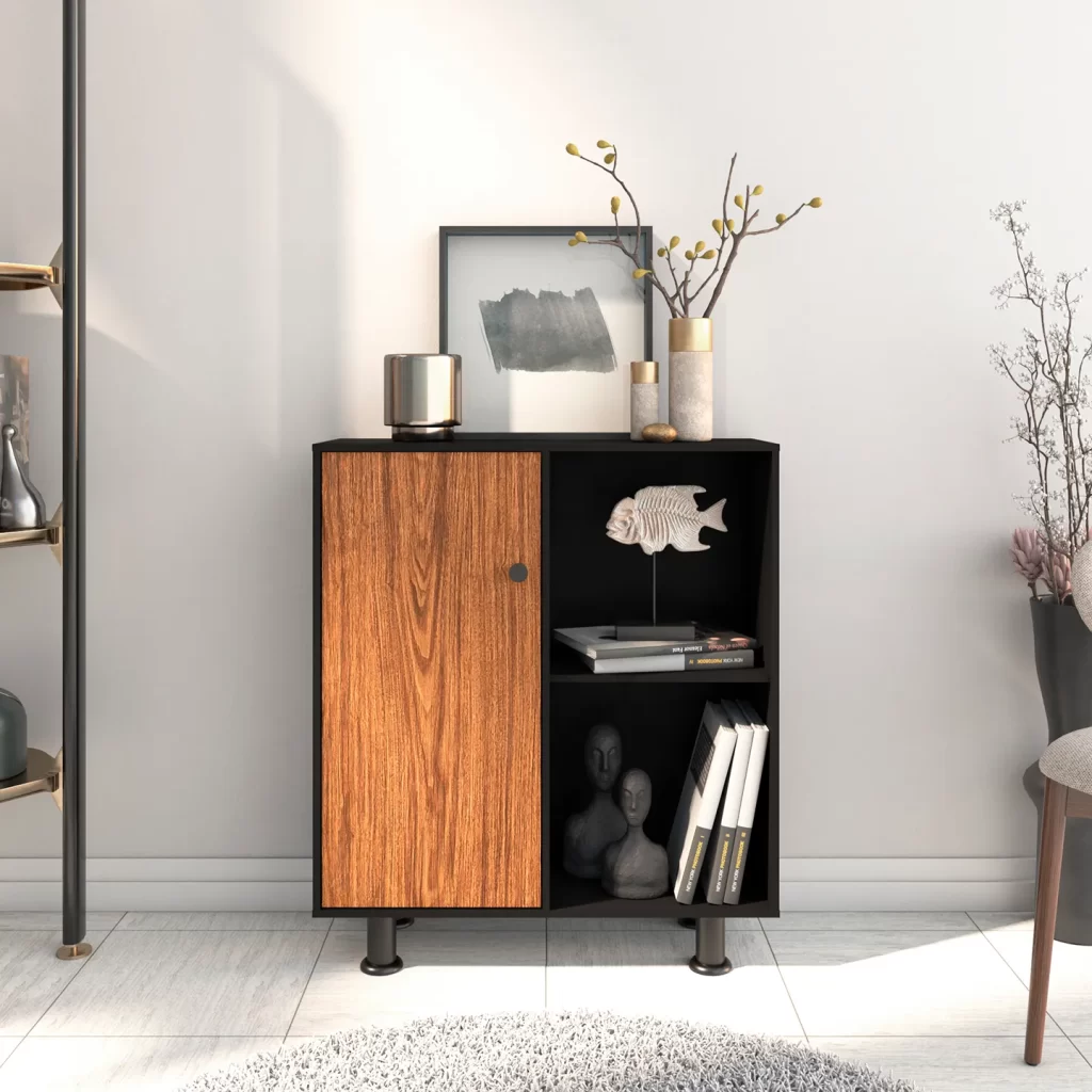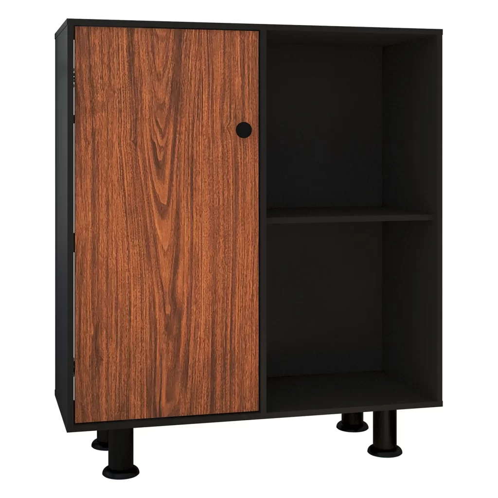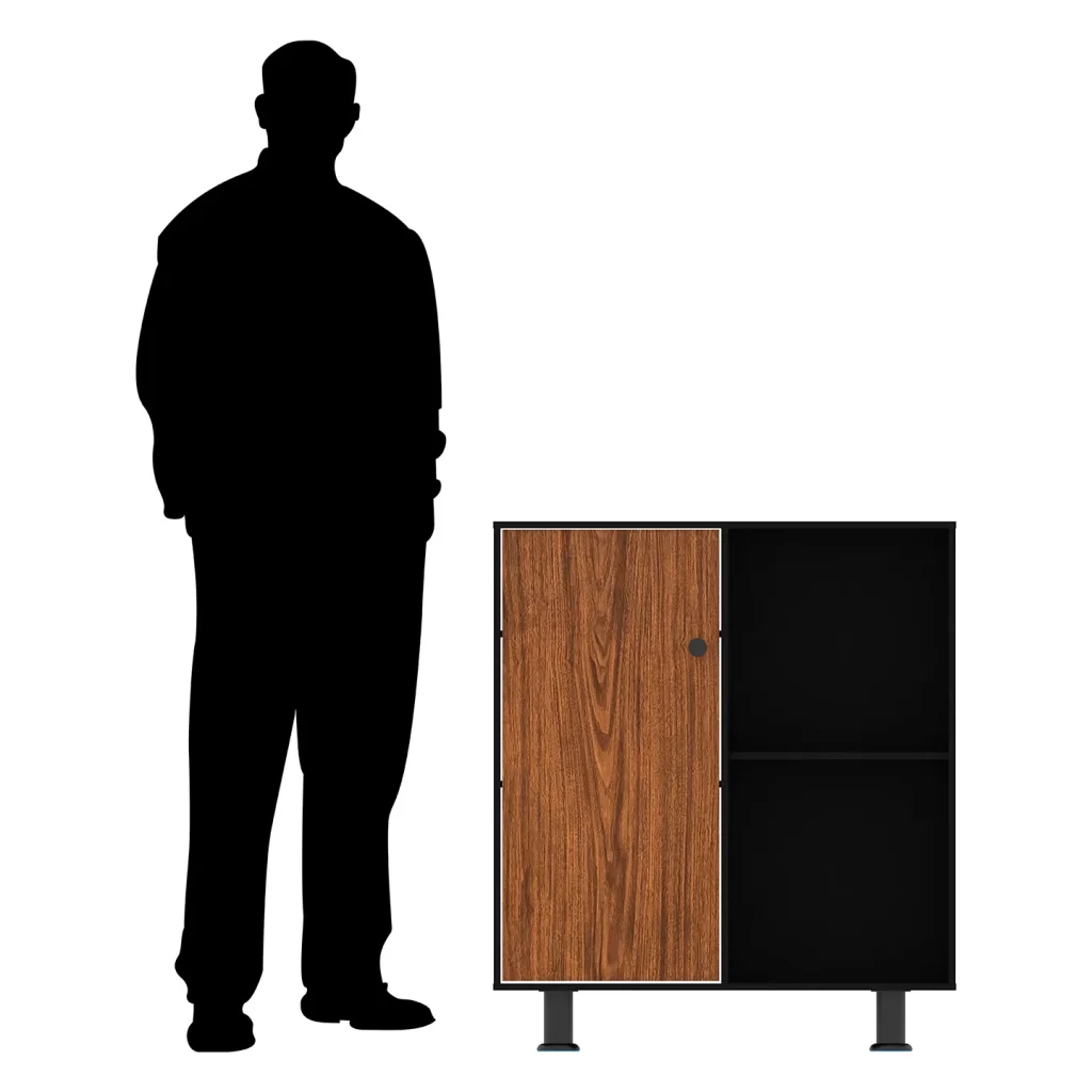 Cómoda PLAYCON modelo Lima, con puerta y repisas abiertas, patas metálicas y jaladera resistente. Medidas 90.4 x 79 x 30.2 cm. Color Gris/Negro.
